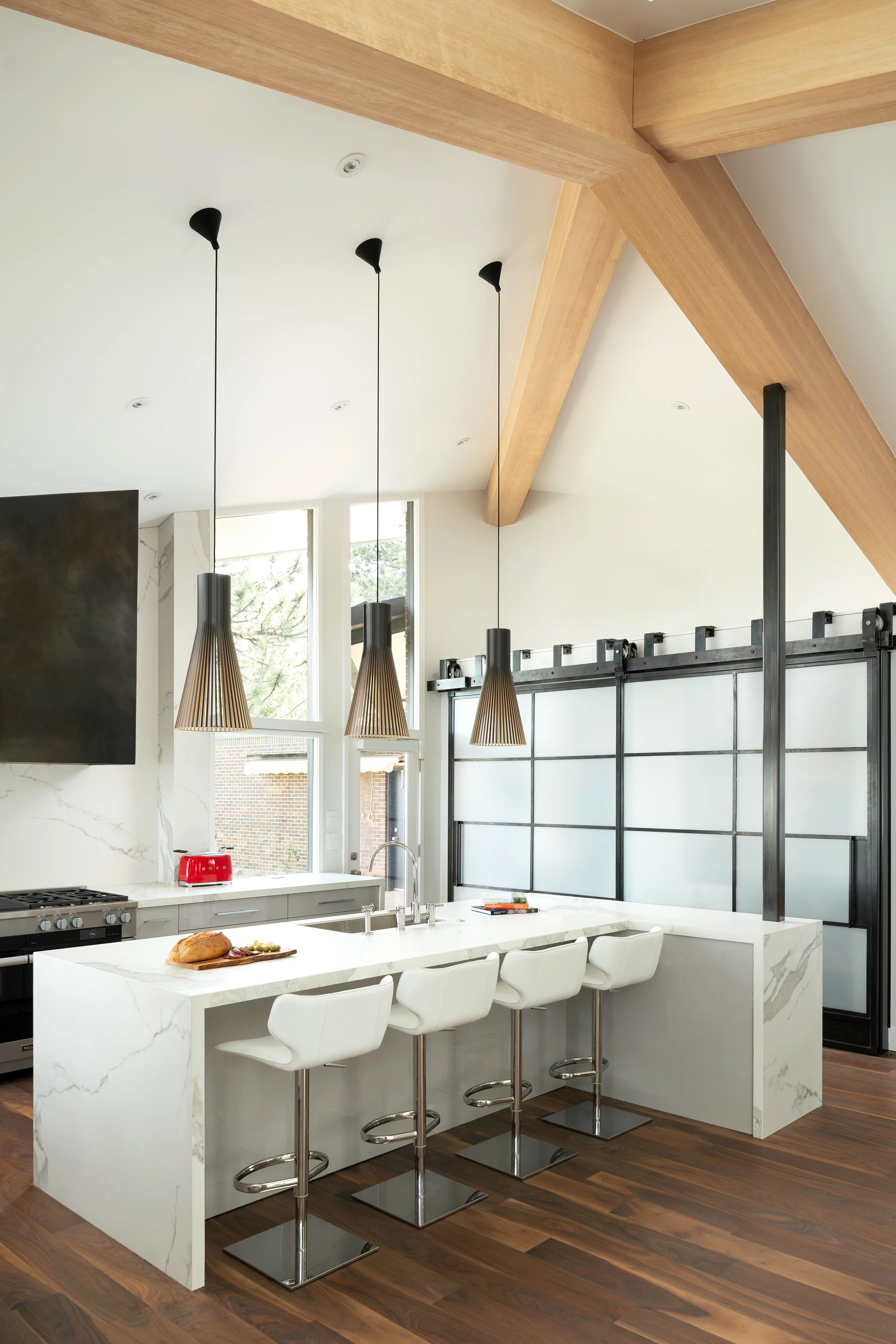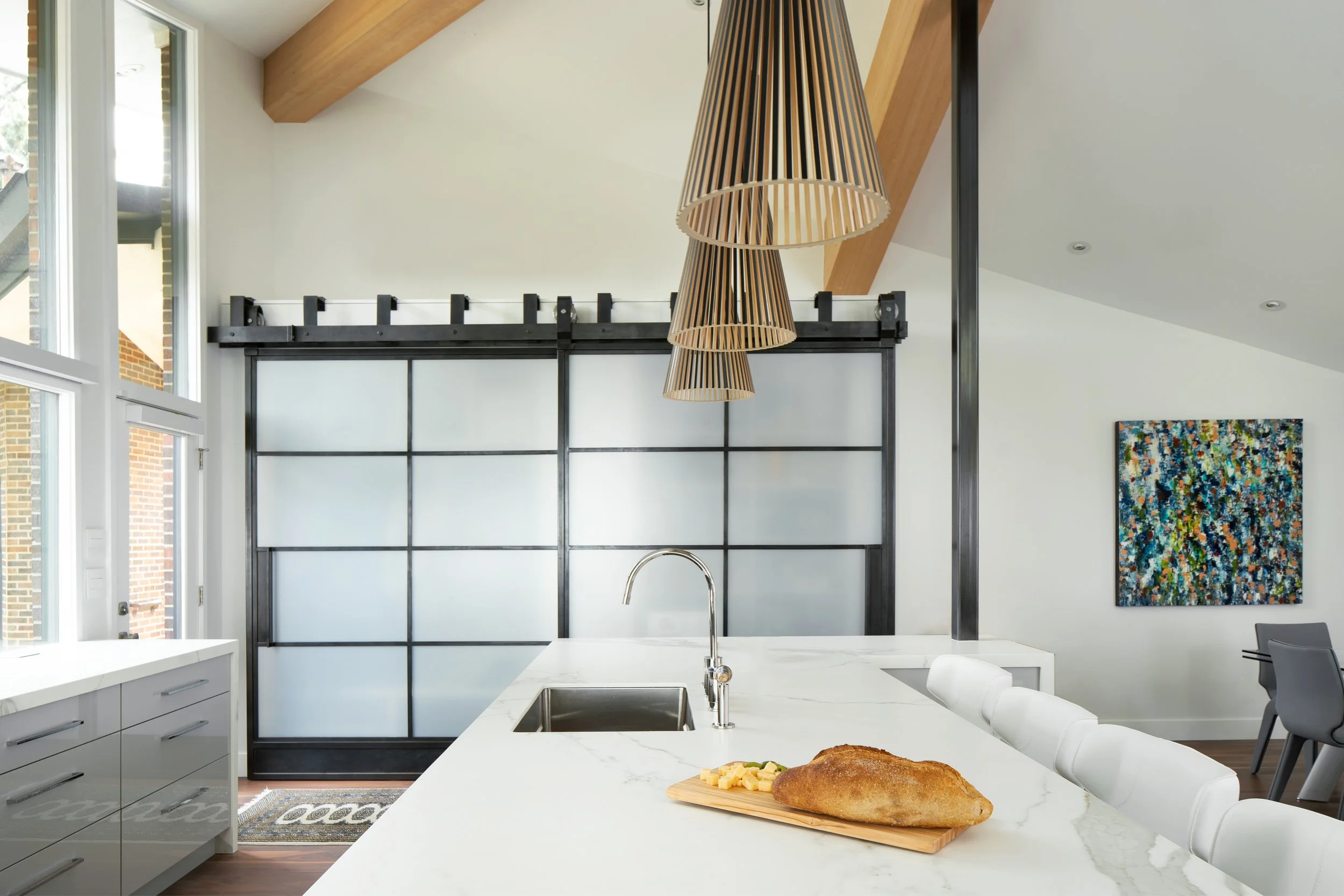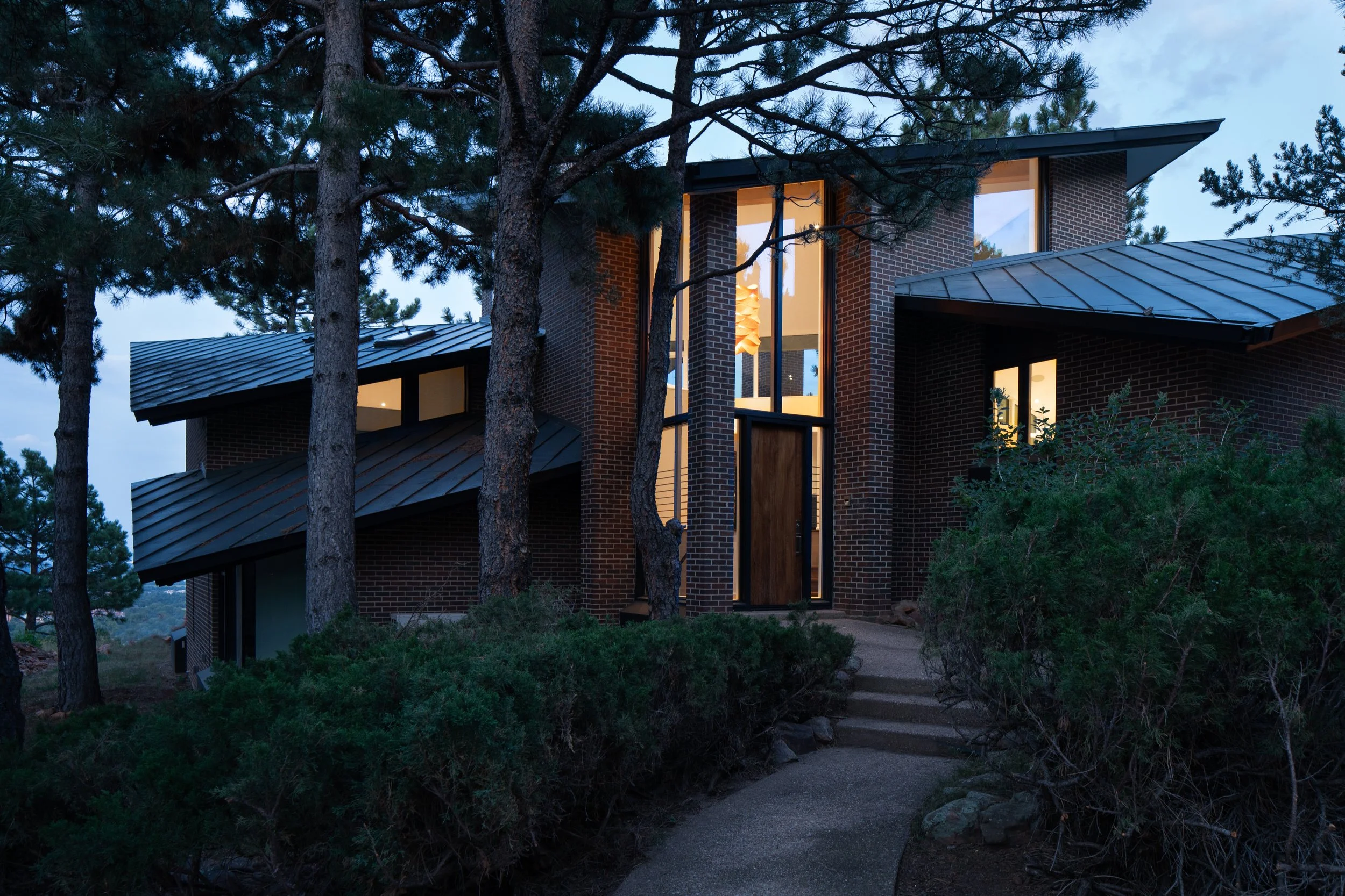 Brick House is a full remodel of a striking 1967 home perched high in the Boulder foothills, with sweeping views across the city and beyond. Designed for a busy business owner who loves to entertain, the project reimagines a highly unique structure into a polished, modern home that supports work, hosting, and family visits with ease. To introduce flexibility and privacy without disturbing the existing brick, we designed custom steel and glass sliding doors, echoed again in the kitchen pantry doors and a steel-clad range hood. The result is a slick, layered interior that feels intentional, bold, and ready for both everyday living and large-scale gatherings.