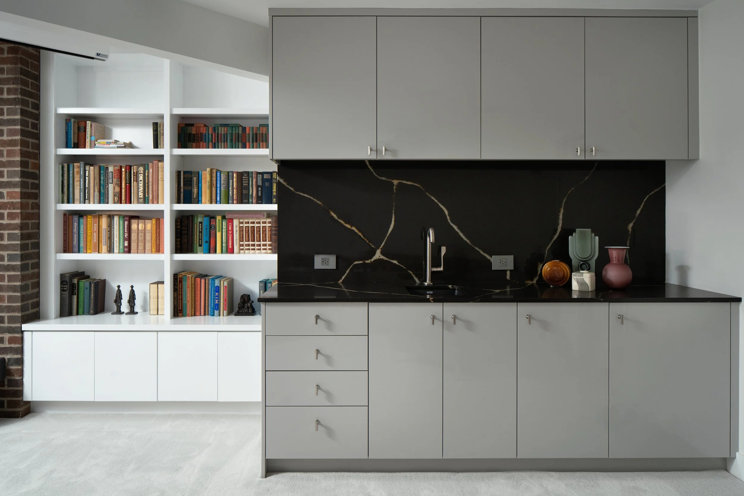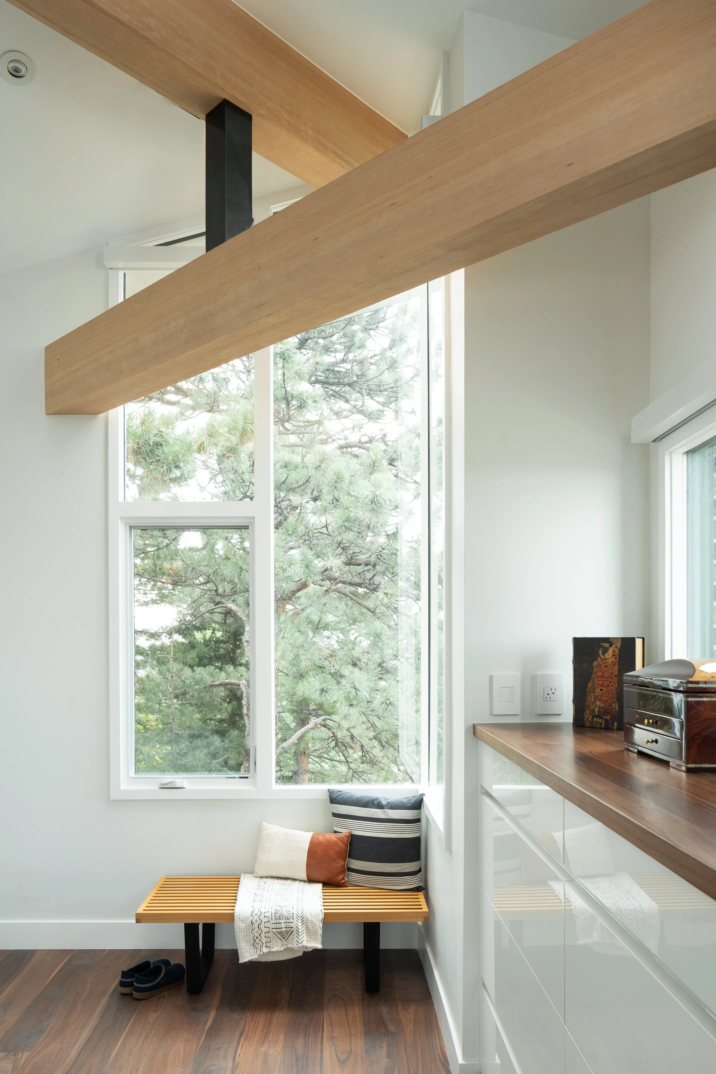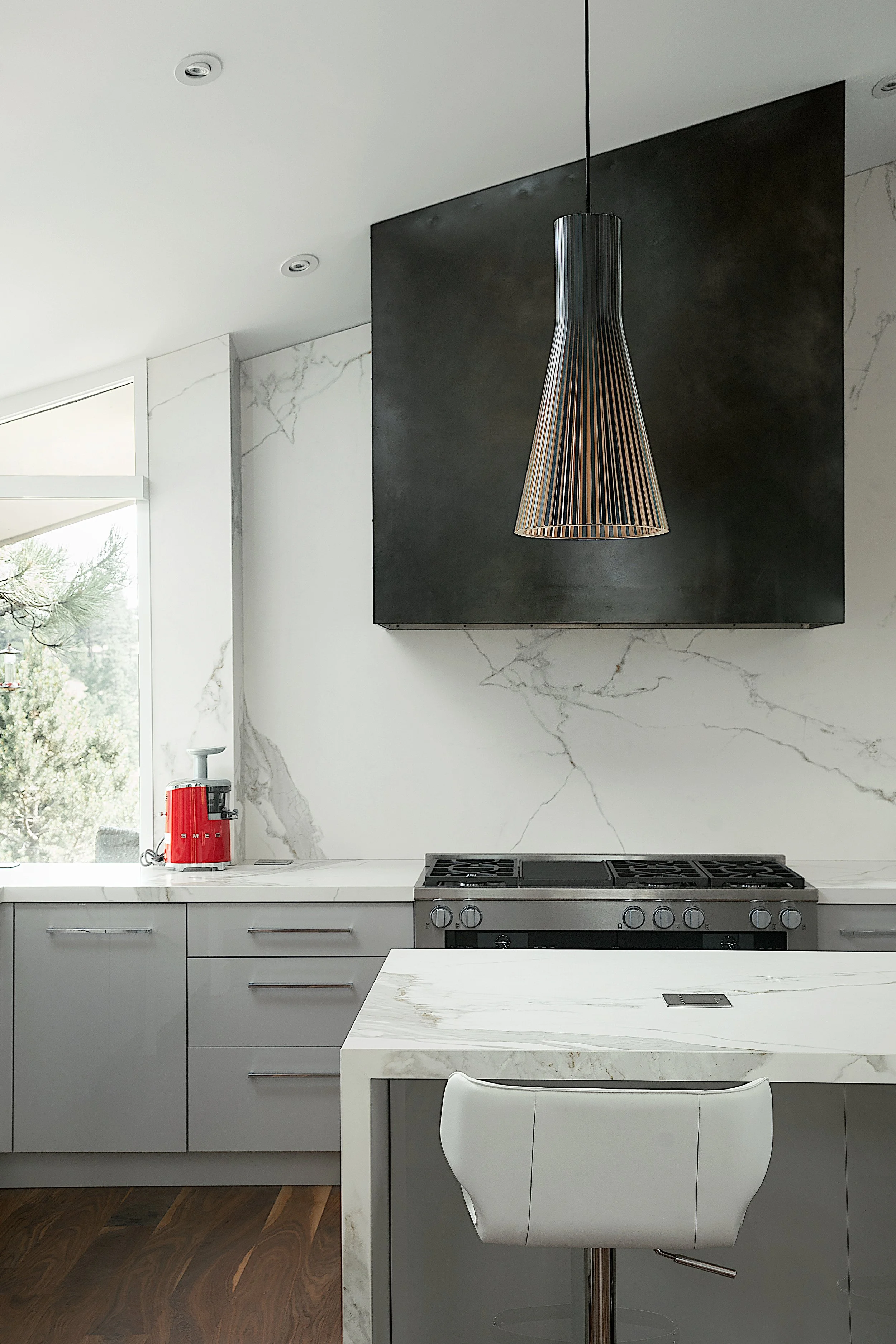 Brick House is a full remodel of a striking 1967 home perched high in the Boulder foothills, with sweeping views across the city and beyond. Designed for a busy business owner who loves to entertain, the project reimagines a highly unique structure into a polished, modern home that supports work, hosting, and family visits with ease. To introduce flexibility and privacy without disturbing the existing brick, we designed custom steel and glass sliding doors, echoed again in the kitchen pantry doors and a steel-clad range hood. The result is a slick, layered interior that feels intentional, bold, and ready for both everyday living and large-scale gatherings.