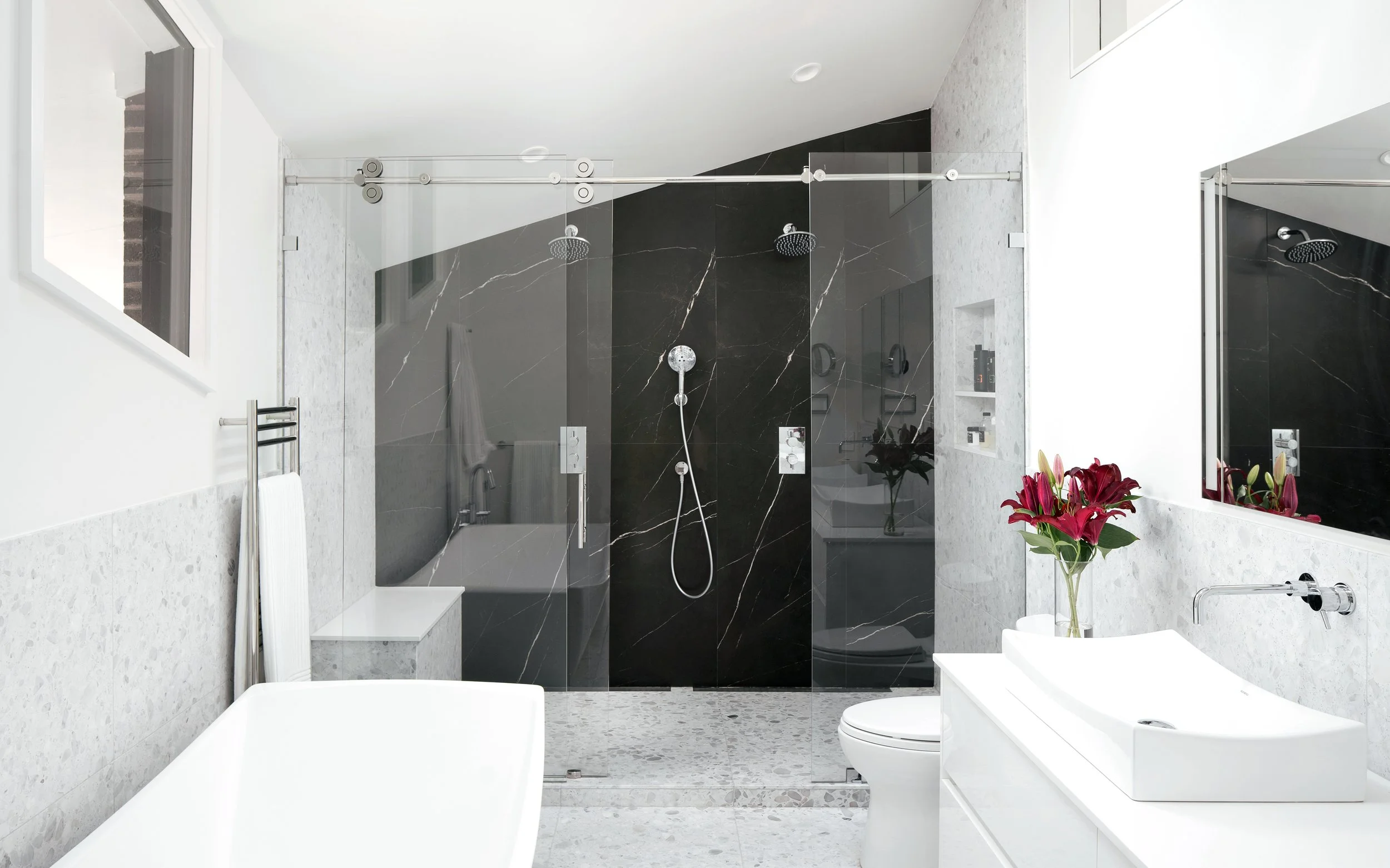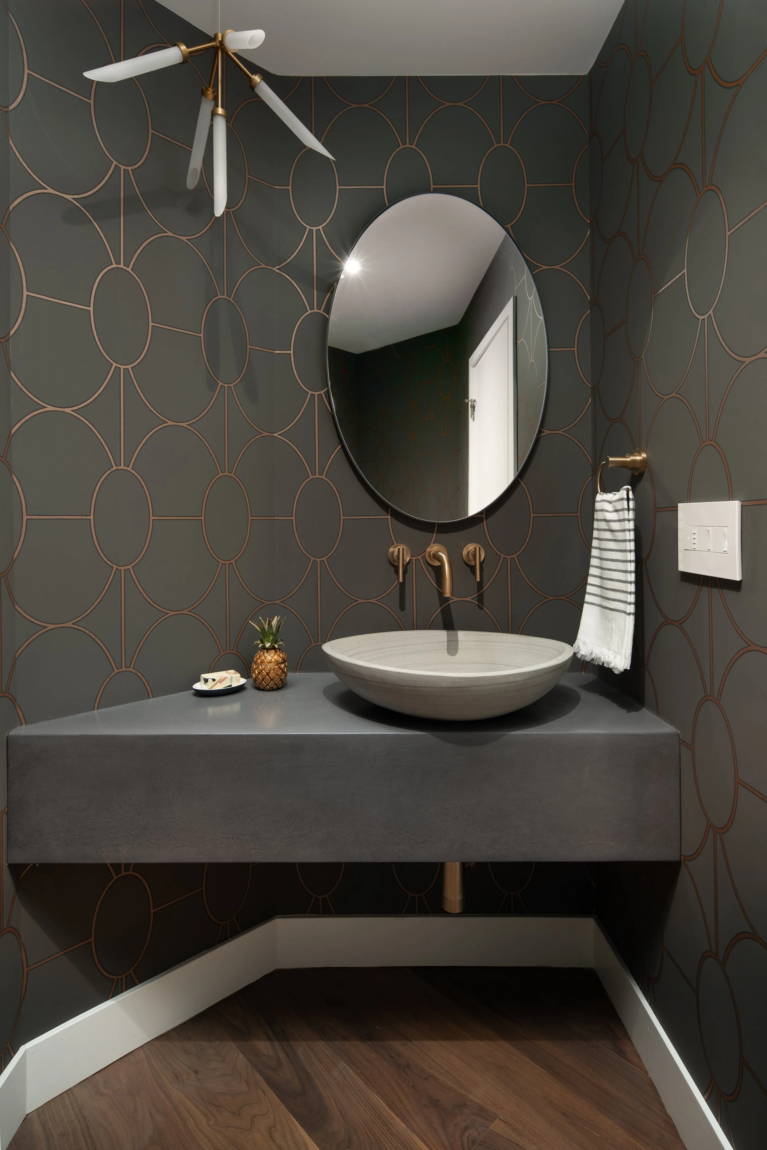 The design embraces the home’s original geometry and dramatic angles, using contrast to add depth and a touch of drama. Custom woodwork and carefully integrated lighting enhance the architecture rather than compete with it.