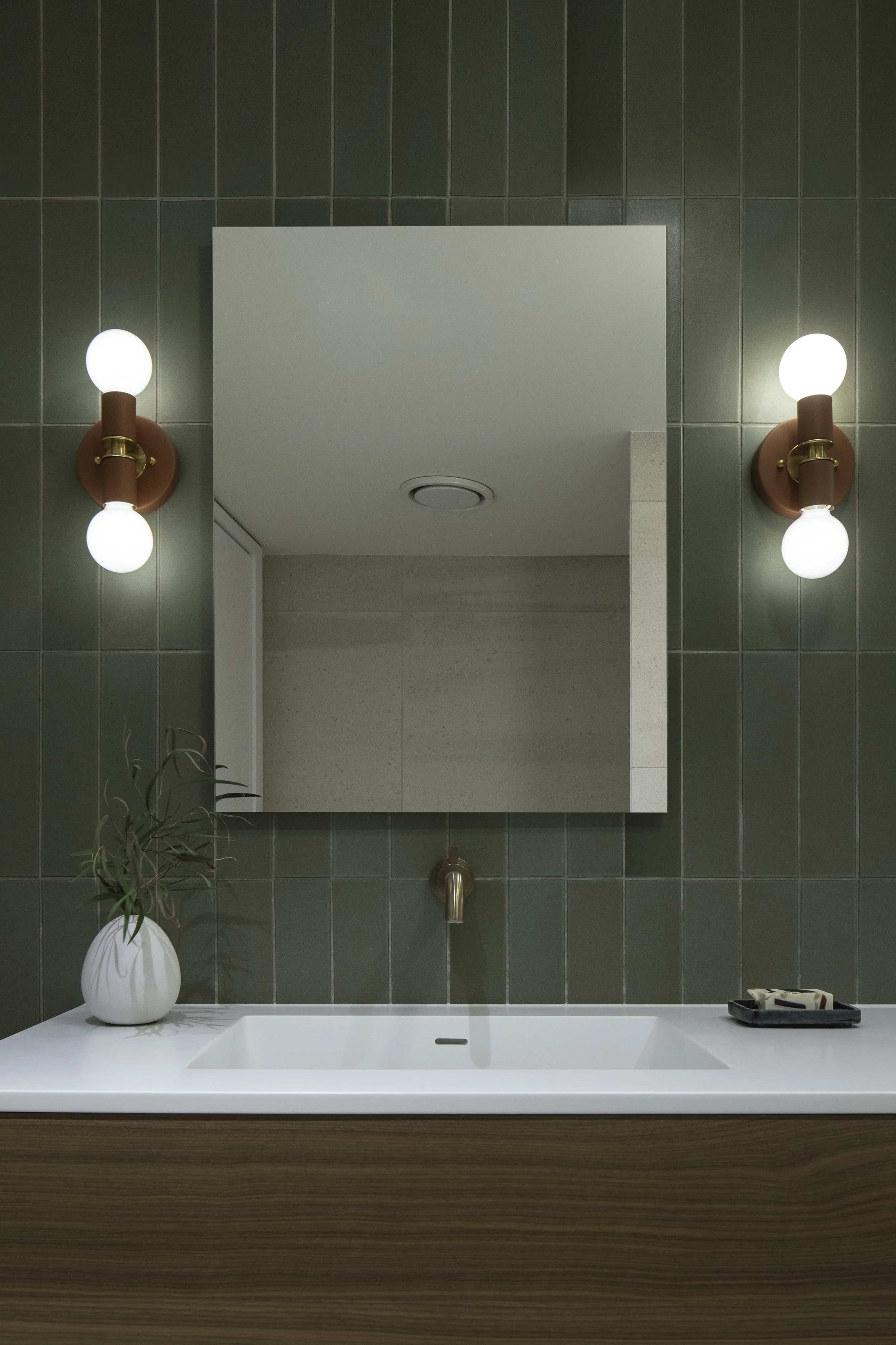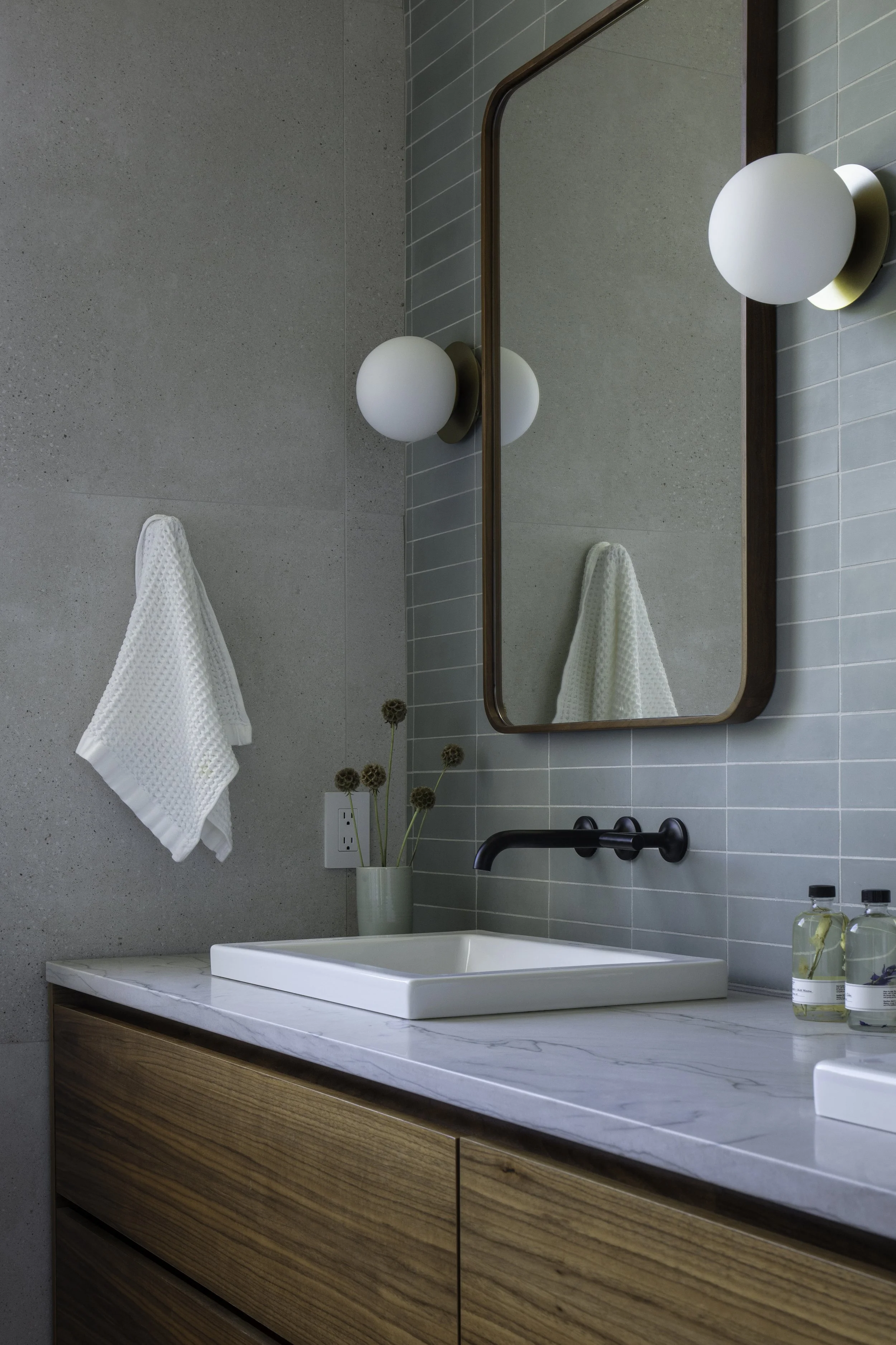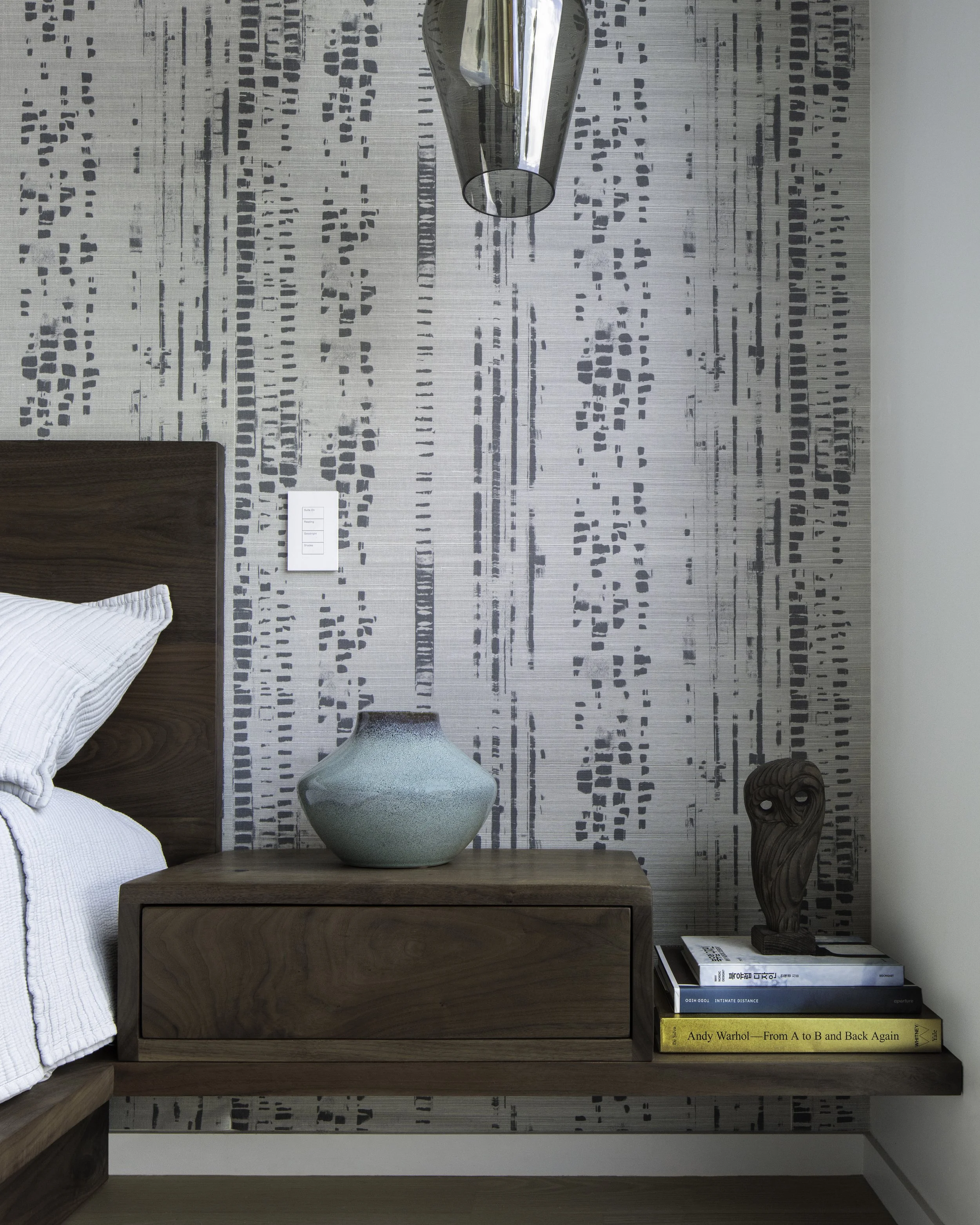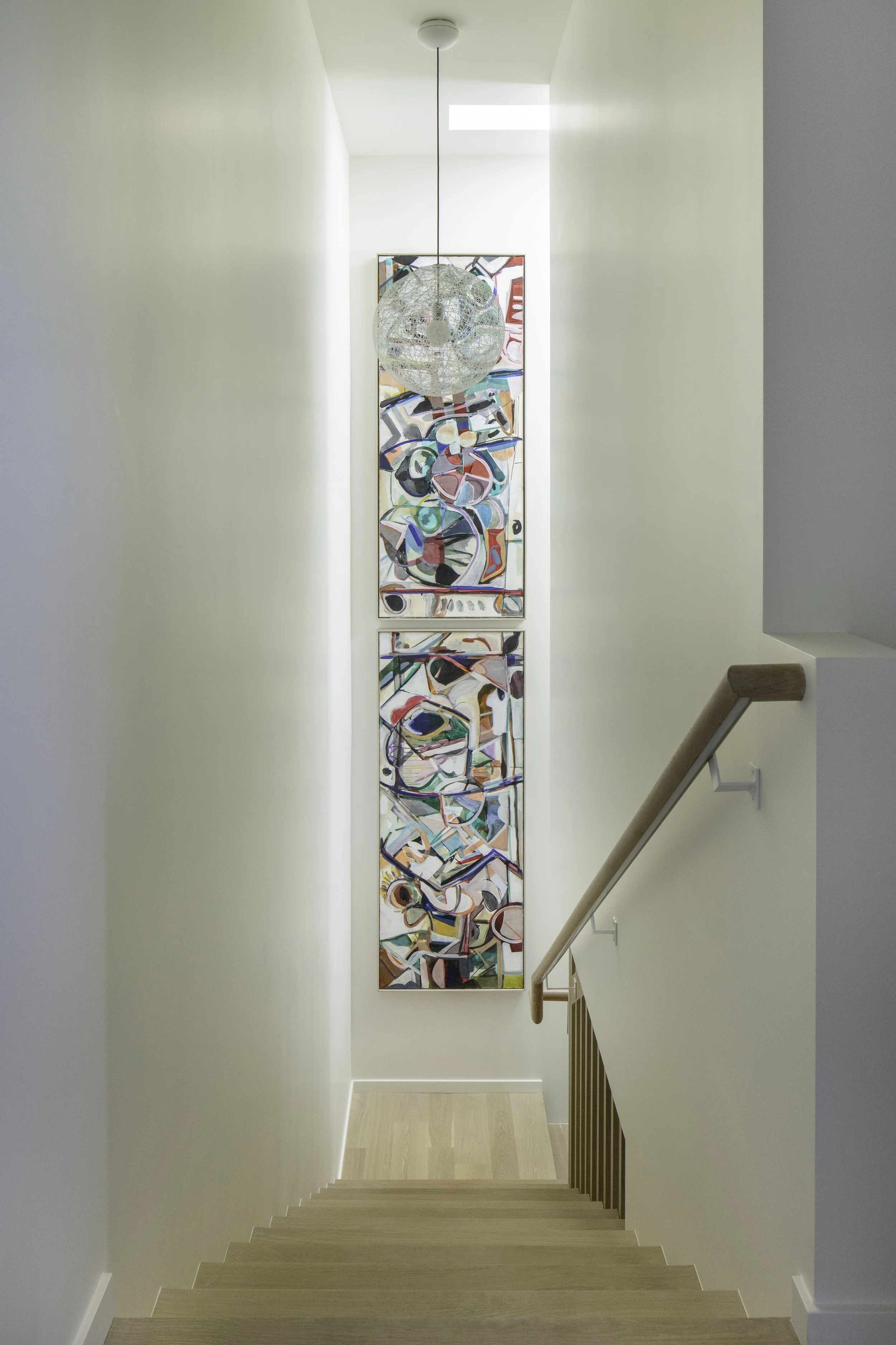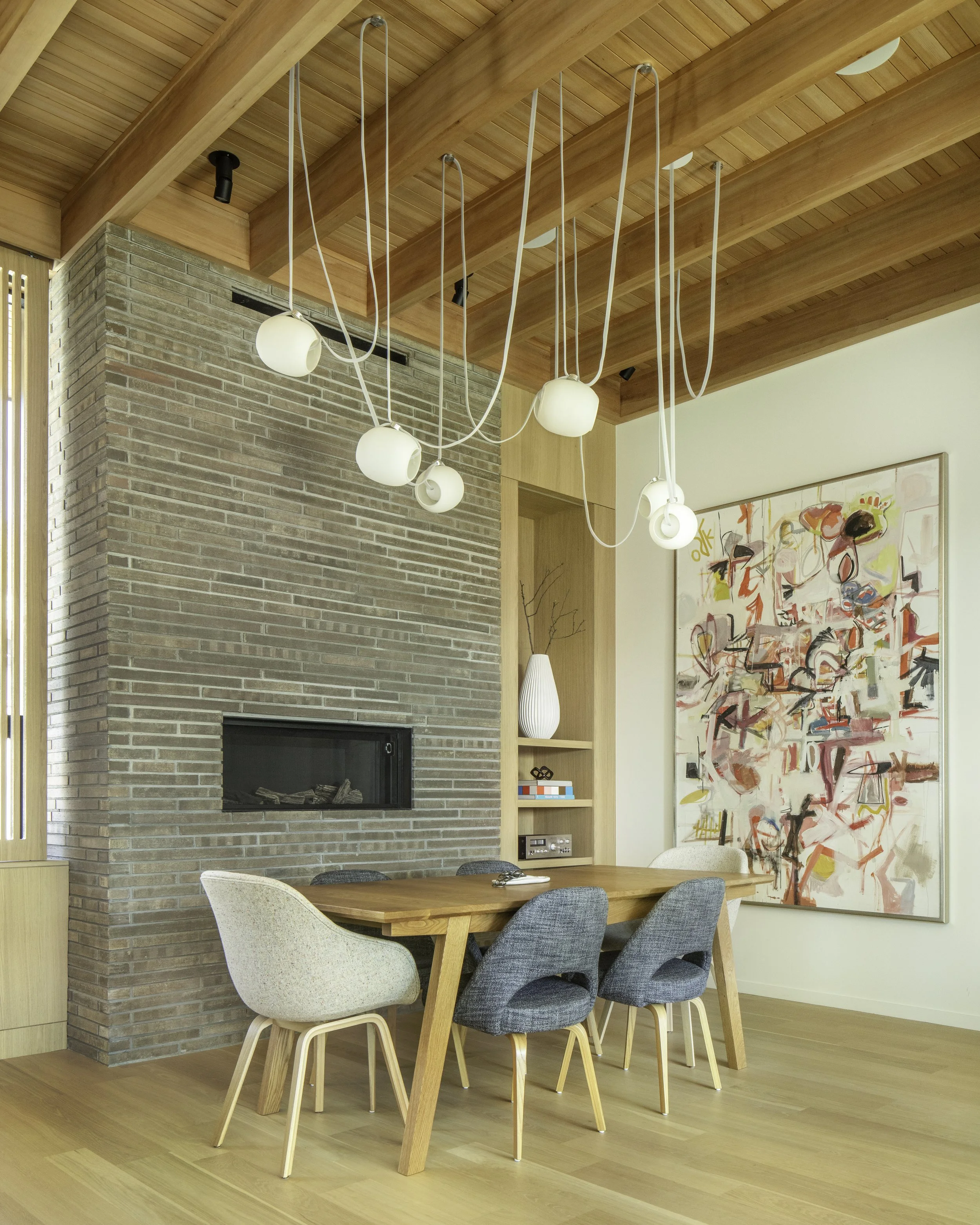 Custom, natural materials give the architecture depth and warmth, while a layered lighting approach shifts the mood throughout the day, energizing mornings and softening evenings. Color in the furniture and tile was carefully chosen to live comfortably alongside the clients’ art collection.
