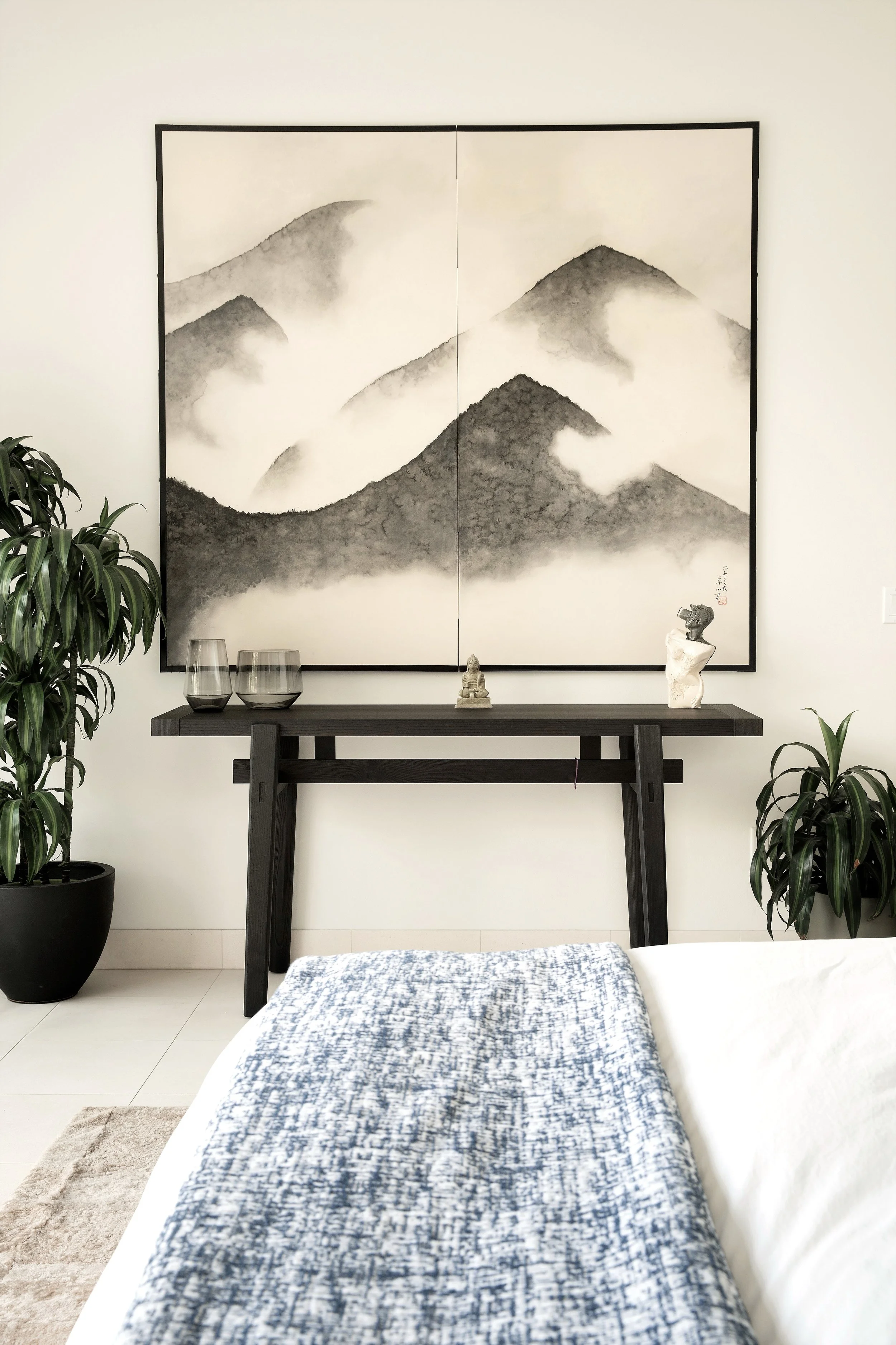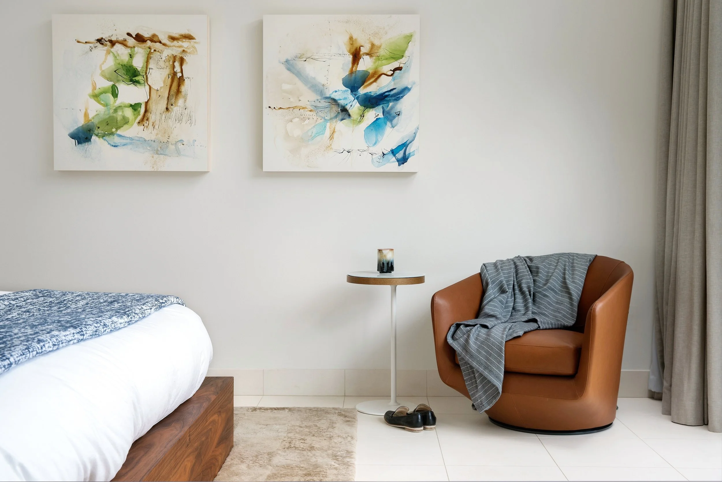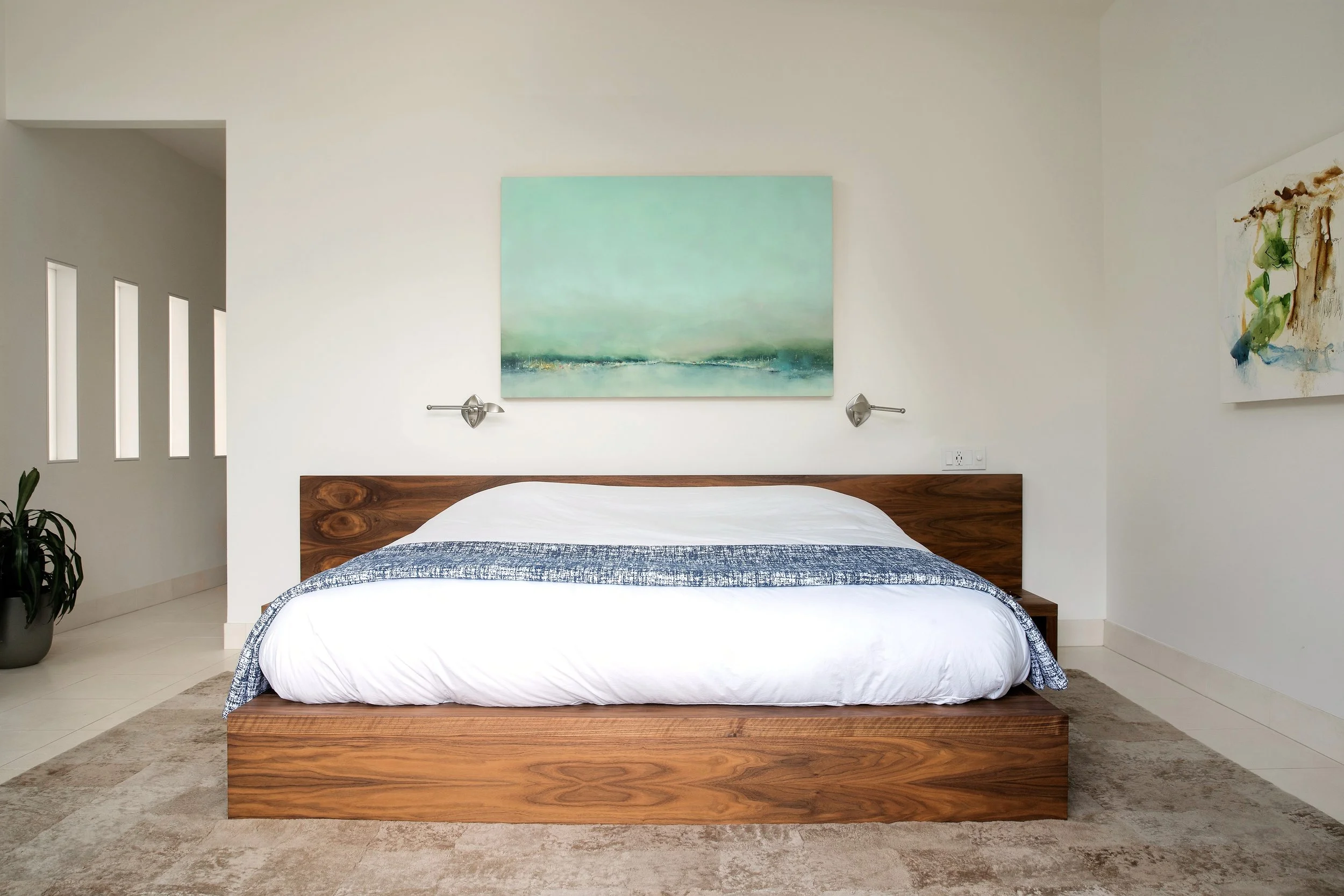 Soft, textural rugs add warmth underfoot, while accents of wood and stone introduce depth. The palette remains neutral, allowing color to emerge through artwork by local artists. Soft colors in the art echo the surrounding landscape, creating a seamless connection between indoors and out.