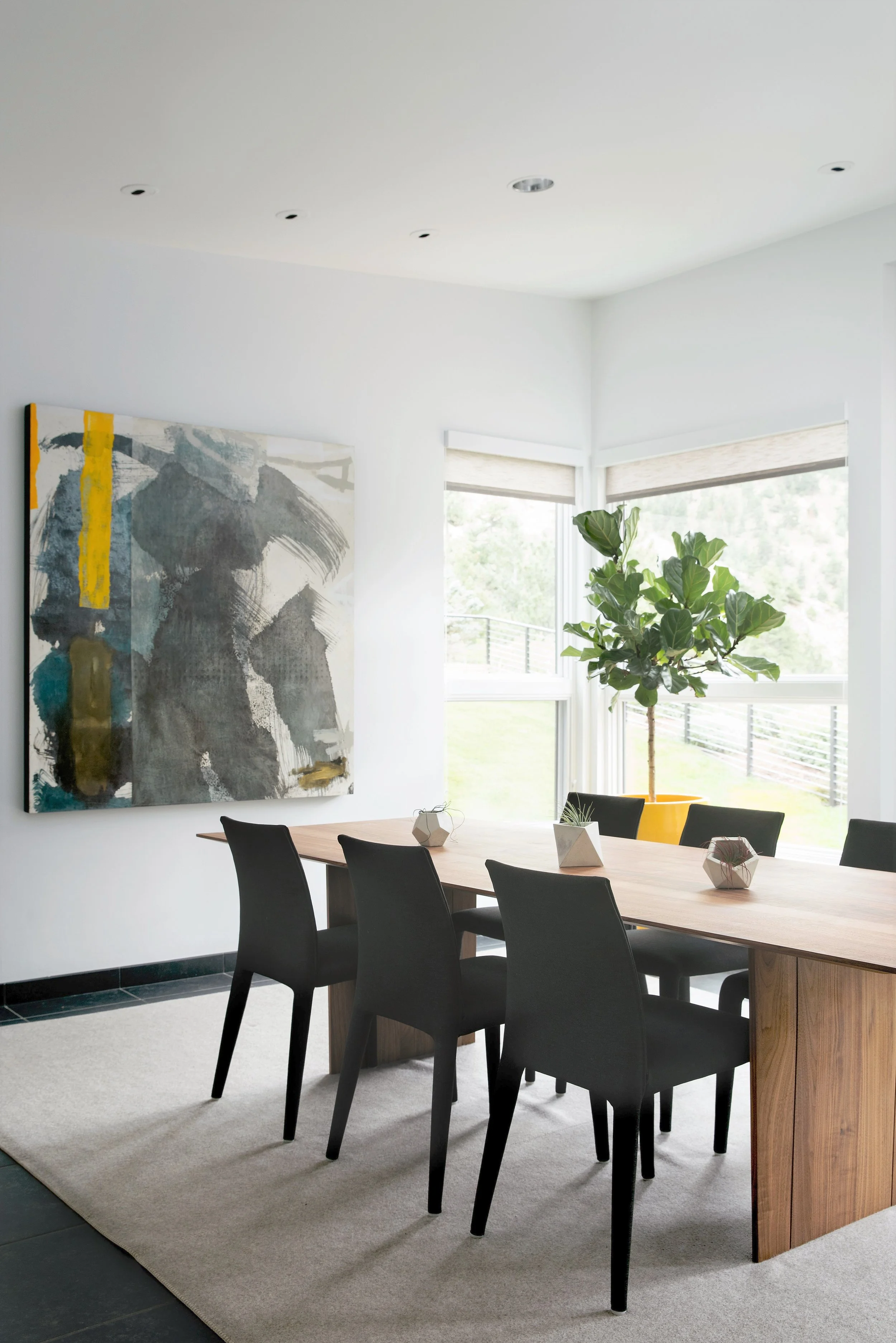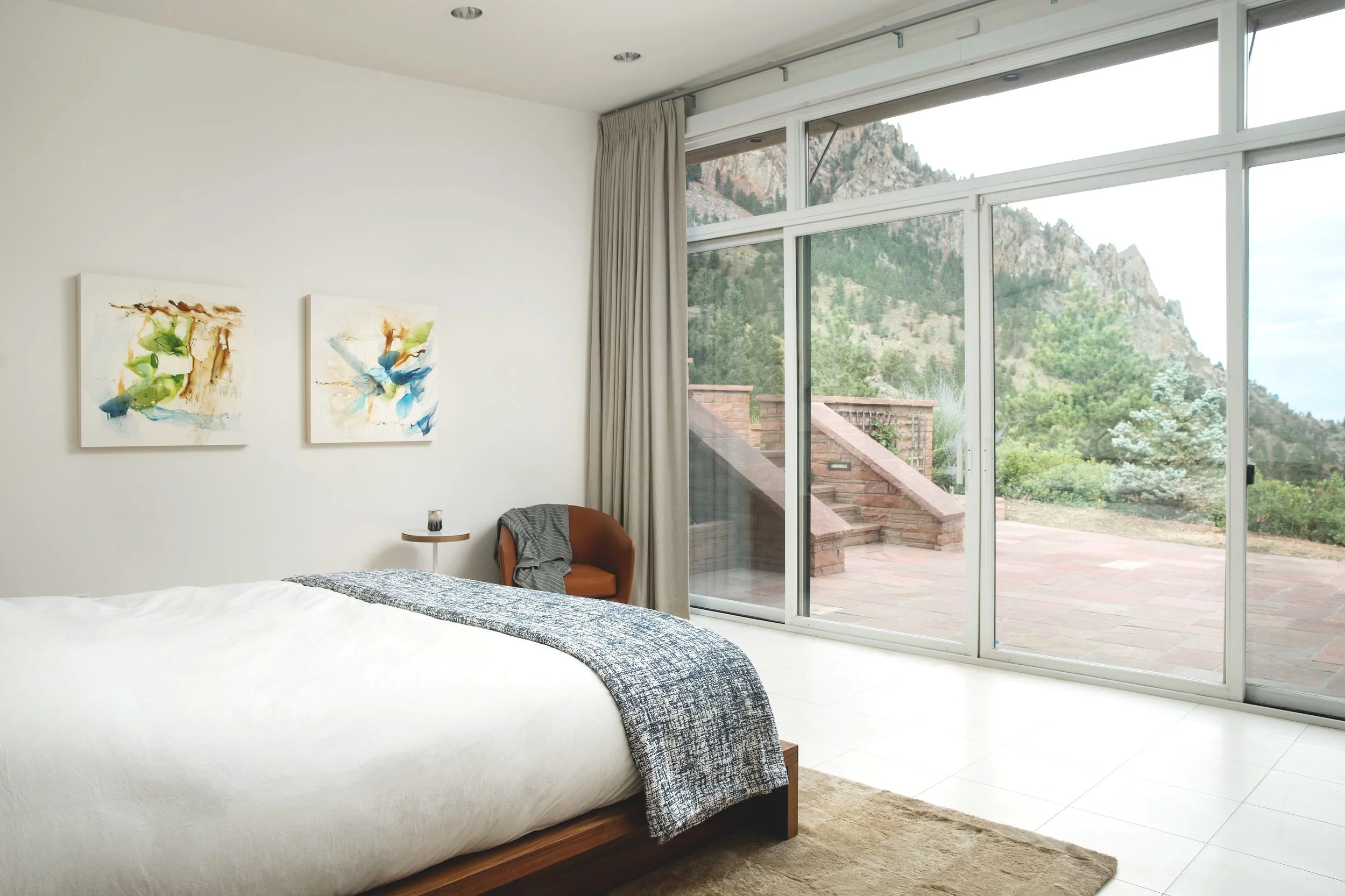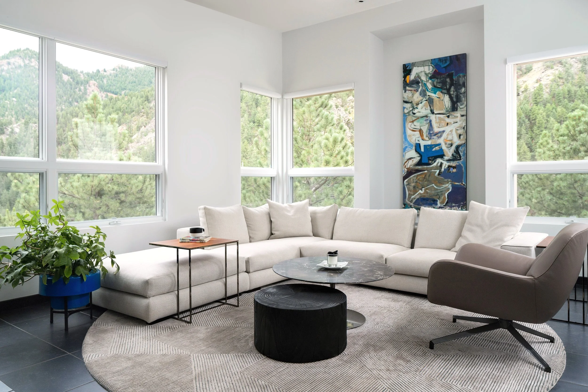 Mountain Minimalist is a furnishing and art-focused project in the foothills of Boulder, created for a tech-savvy entrepreneur seeking a place to slow down and reset. With the architecture already in place, the work centered on personalizing the home through thoughtful layers of natural materials. Furniture was selected for quality and longevity, with varied seating defining different zones within the open plan and supporting how the client moves through the home.